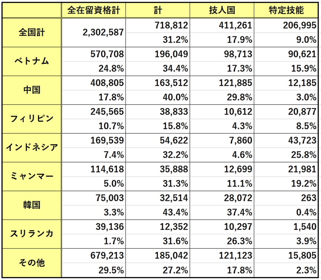 まず、ベトナム出身の労働者は総数570,708人で、そのうち技人国は98,713人(17.3%)、特定技能は90,621人(15.9%)です。ベトナム人は技人国も特定技能も共に割合が高く、両ビザにおいて人数差があまりないという特徴があります。