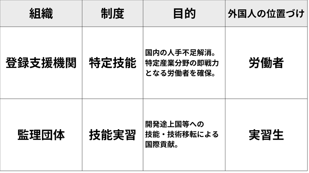 この違いは、制度の目的が「労働者の支援代行」か「技能移転の監督」かという点に起因します。