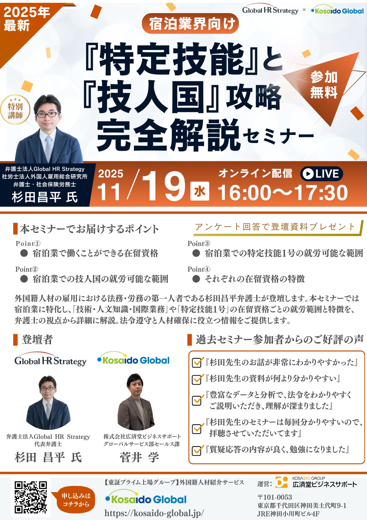 KosaidoGlobalでは、宿泊事業者様向けに外国籍人材採用最新動向セミナーを開催します。