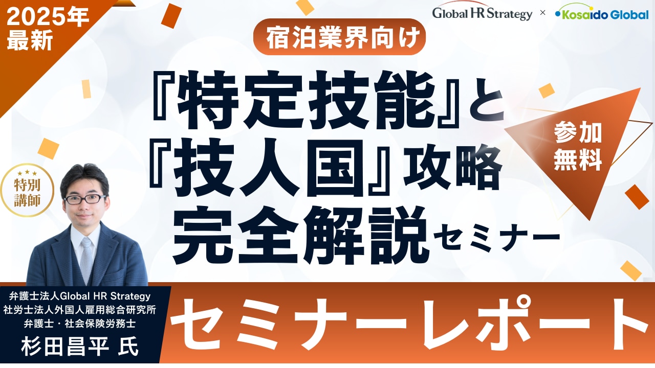 2025年11月19日(水)に開催した【宿泊業界向け 『特定技能』と『技人国』攻略 完全解説セミナー】。外国籍人材の雇用に関する法務・労務の第一人者である弁護士の杉田昌平氏をお招きし、宿泊業における「技術・人文知識・国際業務」や「特定技能1号」の在留資格ごとの就労範囲と特徴を、弁護士の視点から詳細に解説いただきました。また、質疑応答についてもご対応いただいております。