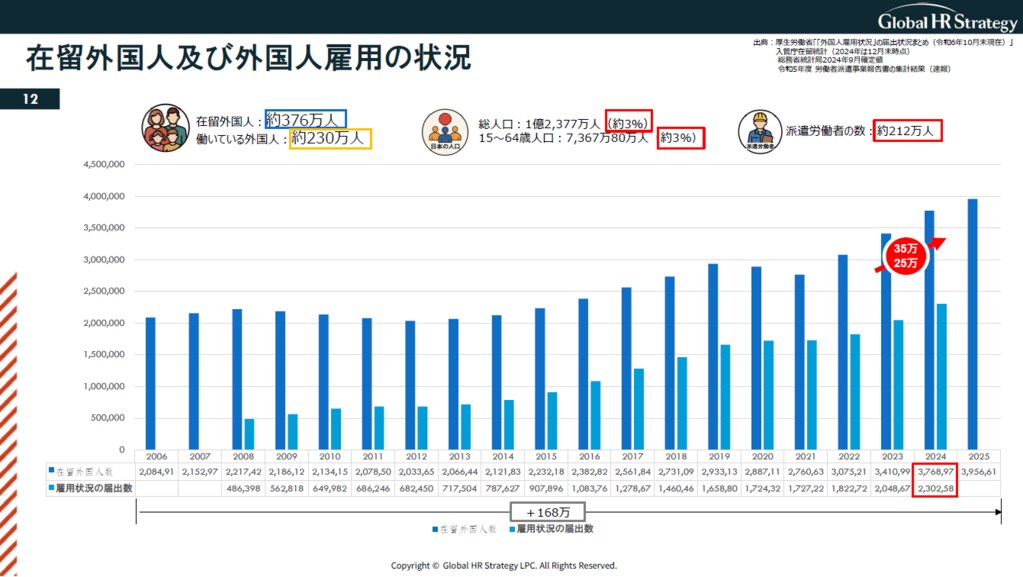 2024年 12月末時点で日本に住んでいる外国籍の方は376万人です。そのうち、230万人が働いているという状態です。