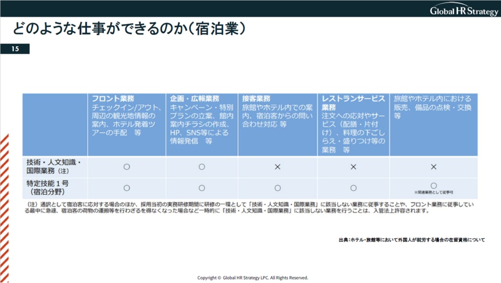2023年8月に入管庁から公表された指針に基づき、「技人国」と「特定技能」の宿泊業での就労範囲が明確に線引きされました。