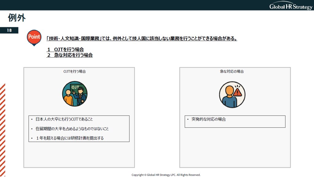 OJT(研修計画に基づく実務研修)または突発的・緊急な対応の場合のみ、例外的に非該当業務への従事が許容されます。ただし、OJT終了後は技人国該当業務に100%従事することが前提です。