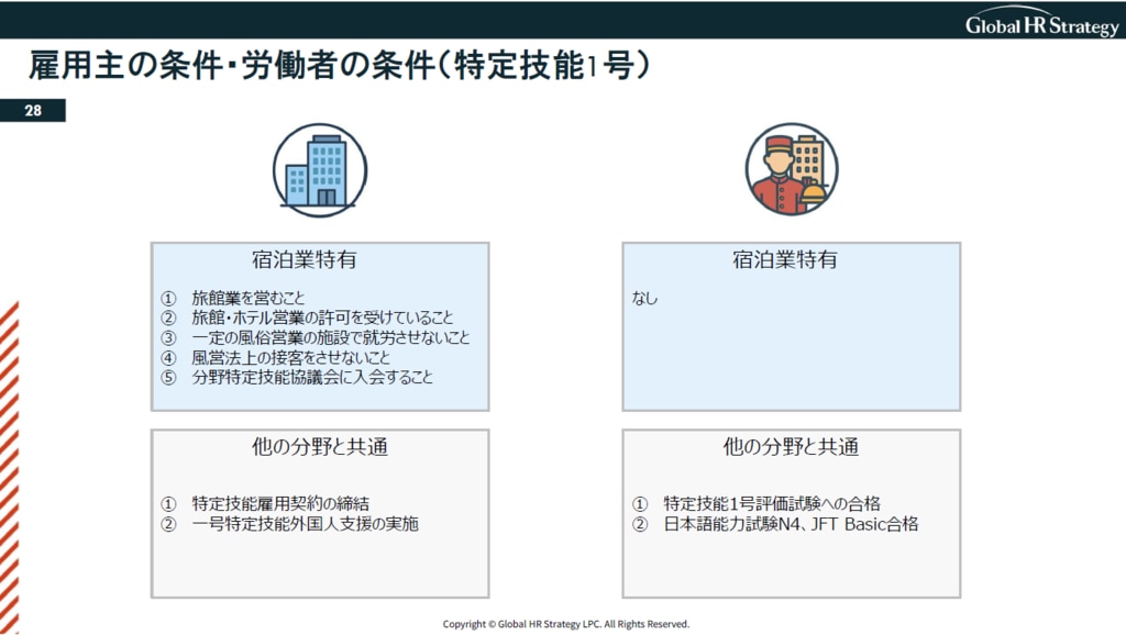 宿泊業の人材不足解消に不可欠な「技術・人文知識・国際業務(技人国)」と「特定技能1号」について、弁護士の視点から、その就労可能な範囲(境界線)と特徴が詳細に解説されました。