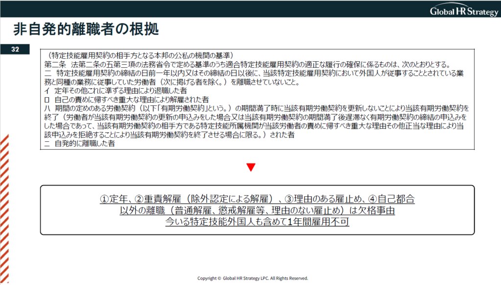 定年退職、雇用保険法の重責解雇、理由のある雇い止め、自己都合。この4つのケース以外に該当する場合、たとえば普通解雇をしてしまうと、1年間の受け入れ停止になってしまいます。注意が必要なのは、外国人だけでなく、日本人も対象である、ということです。特定技能人材と同じ仕事をする日本人の方を普通解雇しても、該当します。