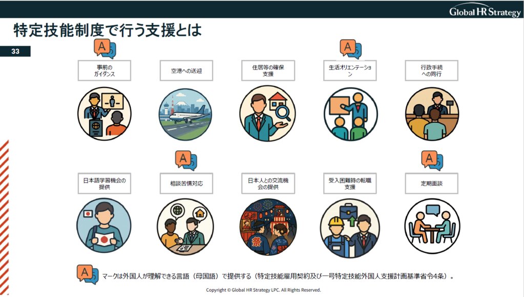 事前ガイダンス、生活オリエンテーション、相談苦情対応、定期面談などは基本的には外国人の理解できる言語であることが求められます。厳密には母国語に限りませんが、母国になることが多いです。