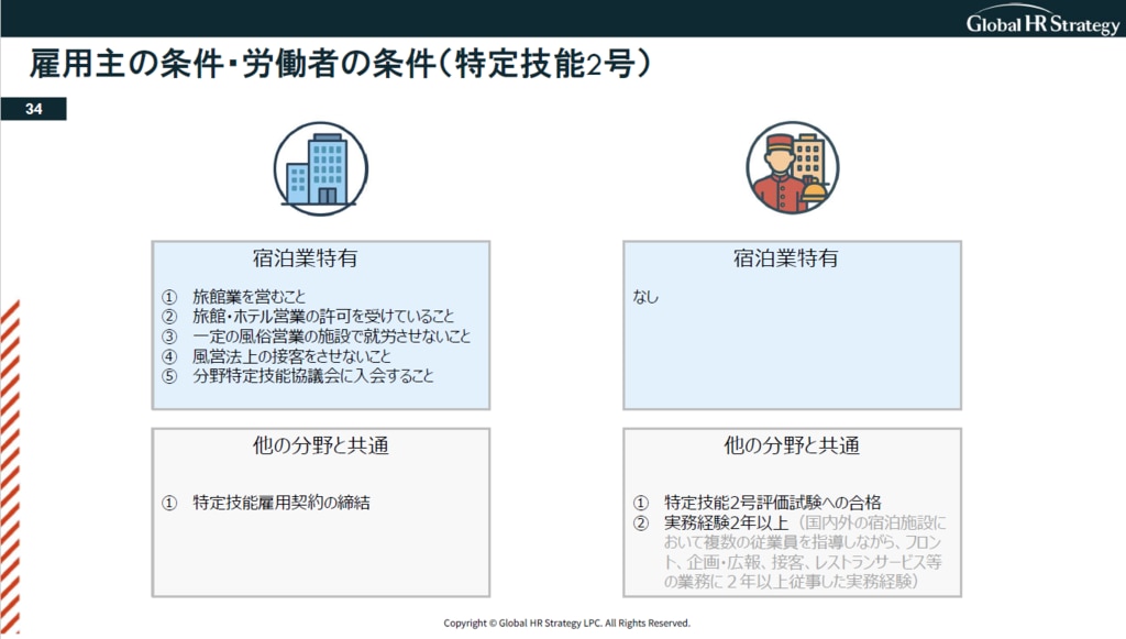 特定技能2号についても触れていきます。特定技能2号評価試験へ合格し、宿泊業界の実務経験が2年以上あれば、取得することができます。