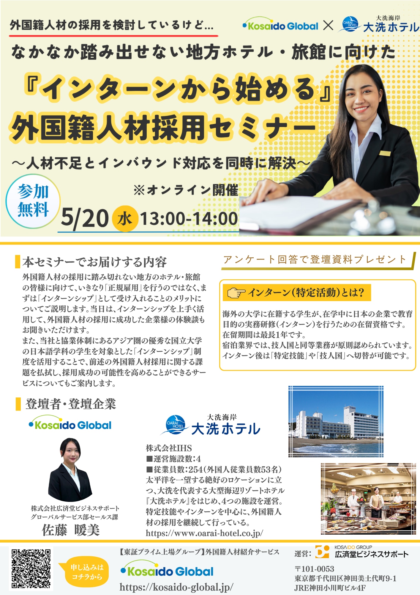KosaidoGlobalでは、 【外国籍人材の採用を検討しているけど・・・なかなか踏み出せない地方のホテル・旅館に向けた『インターンから始める』外国籍人材活用セミナー〜人材不足とインバウンド対応を同時に解決〜】 を開催します。