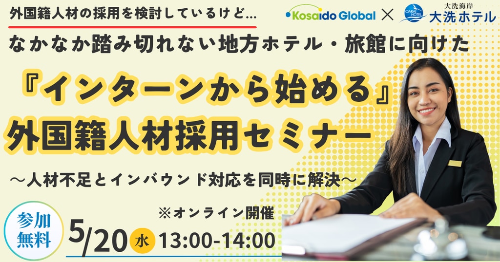 本セミナーでは、外国籍人材の採用に踏み切れない地方のホテル・旅館の皆様に向けて、最初から「正規雇用」を行うのではなく、まずは「インターンシップ」として受け入れることのメリットについてご説明します。当日は、インターンシップを上手く活用して、外国籍人材の採用に成功した企業様の体験談もお聞きいただけます。